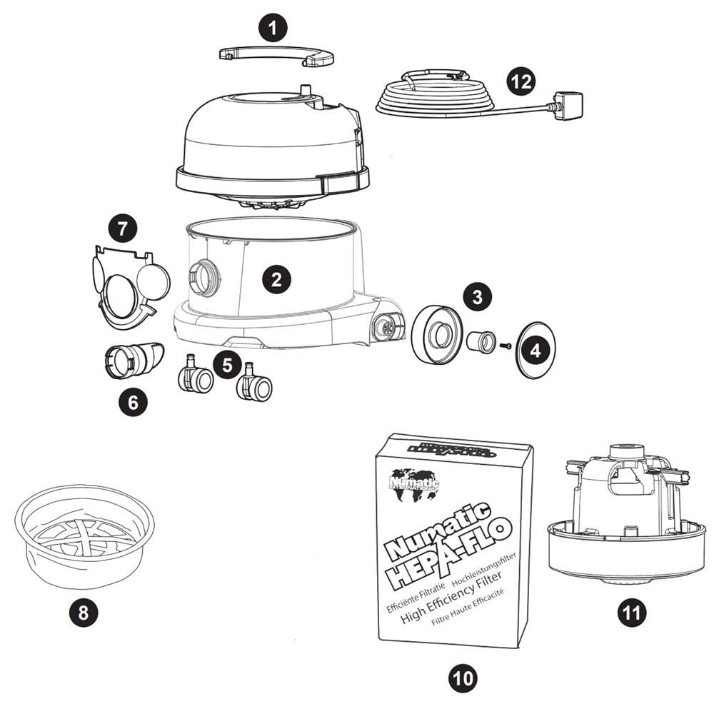 The Complete Assembly for the Numatic HVR170 Vacuum Cleaner includes essential components to ensure optimal performance and longevity. Designed for both genuine and non-genuine parts, this assembly helps maintain suction power and efficiency. Typical components include hoses, filters, and brushes, all crucial for effective cleaning and maintenance.