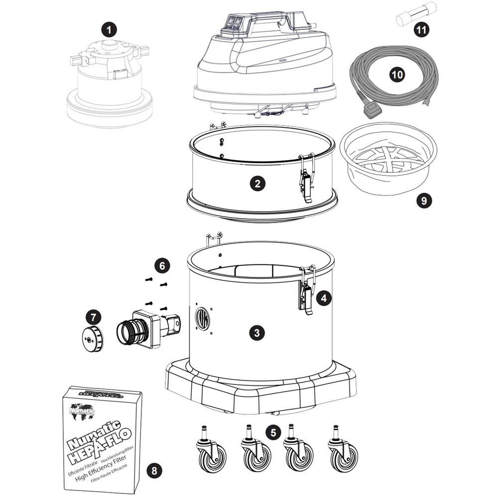 The Complete Assembly for the Numatic MED570A Vacuum Cleaner includes both genuine and non-genuine parts to ensure optimal performance. This assembly is designed to maintain the vacuum's efficiency and longevity. Components such as hoses, filters, and brushes are available, providing comprehensive solutions for routine maintenance and repairs.