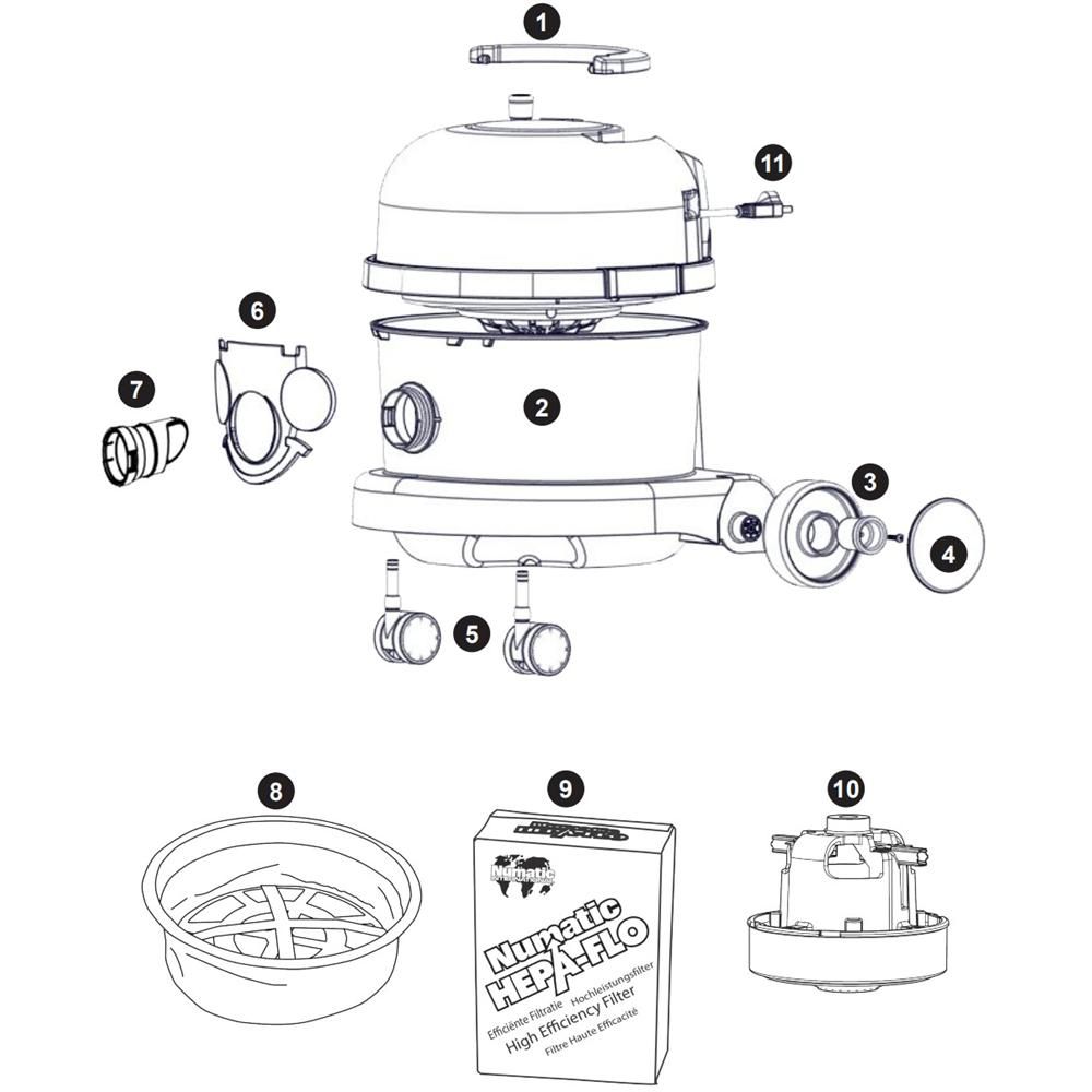 The Complete Assembly for the Numatic NRV240 Vacuum Cleaner includes essential components to ensure optimal performance and longevity. This assembly features both genuine and non-genuine Numatic parts, providing options for various maintenance needs. Typical components include hoses, filters, and motor units, all designed to maintain efficient suction and cleaning capabilities.