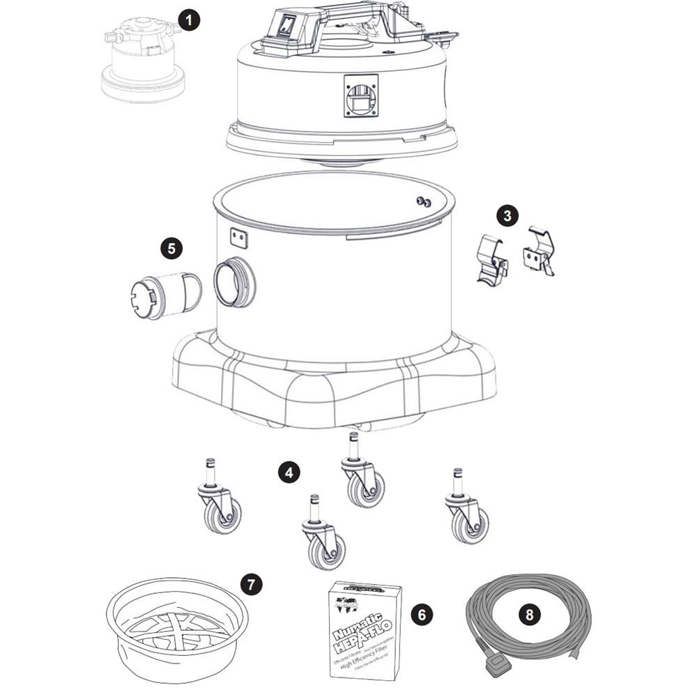 The Complete Assembly for the Numatic NVQ380 Vacuum Cleaner includes essential components to ensure optimal performance and longevity. This assembly features both genuine and non-genuine Numatic parts, designed to maintain suction power and efficiency. Typical components include filters, hoses, and connectors, all crucial for effective cleaning and maintenance.