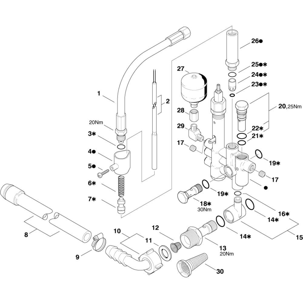 The Control Safety Block Assembly for the Nilfisk MH 4M-90/770 Pressure Washer is designed to ensure safe and efficient operation. This assembly includes key components that regulate and monitor the pressure washer's performance, helping to prevent malfunctions and extend the machine's lifespan. Genuine Nilfisk parts ensure compatibility and reliability.