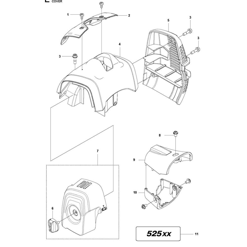 The Cover Assembly for the Husqvarna 525HE3 Hedgetrimmer is designed to protect the internal components and ensure optimal performance. This genuine Husqvarna part helps safeguard the machine against debris and wear, contributing to its longevity and reliability. Essential for routine maintenance, it supports the efficient operation of your hedgetrimmer.
