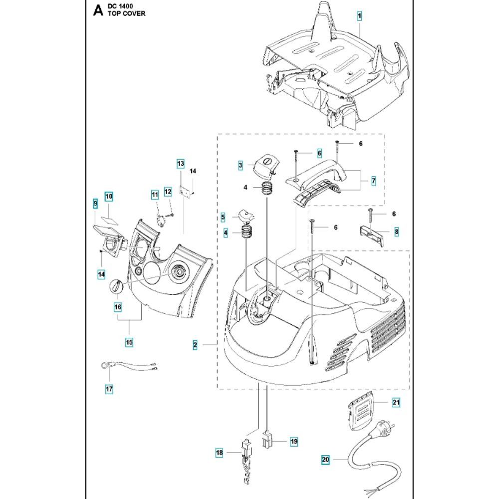 The Cover Assembly for the Husqvarna DC1400 Dust Extractor is designed to ensure optimal performance and protection of the machine. This genuine Husqvarna part helps maintain the dust extractor's efficiency by safeguarding internal components from dust and debris. Essential for routine maintenance, it contributes to the longevity and reliability of the equipment.