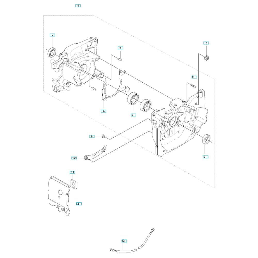 The Crankcase Assembly for the Husqvarna 343FRM Brushcutter is essential for housing the engine's moving parts, ensuring optimal performance and longevity. This assembly includes components such as gaskets, seals, and bearings, which are crucial for maintaining engine integrity and reducing wear. Designed for the Husqvarna 343FRM, it supports efficient operation and reliable cutting performance.