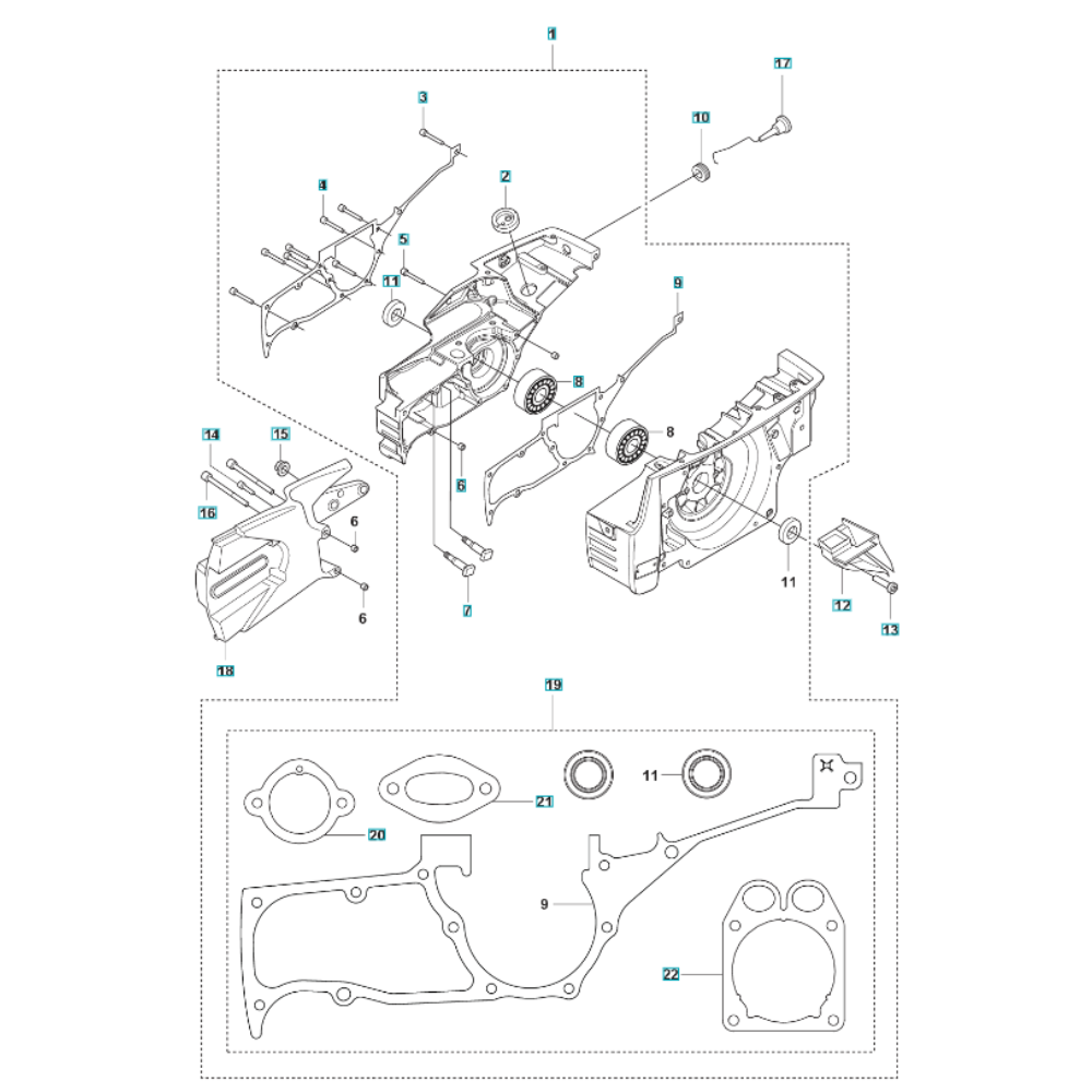 The Crankcase Assembly for the Husqvarna K1270 II Smartguard Disc Cutter is designed to house and protect the engine components, ensuring optimal performance and longevity. This assembly includes key parts such as gaskets, seals, and bearings, which are essential for maintaining the integrity and efficiency of the disc cutter. Genuine Husqvarna parts ensure compatibility and reliability.