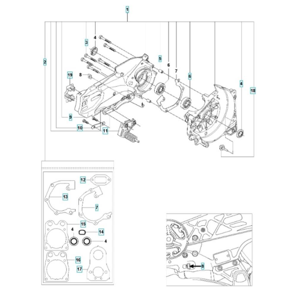 The Crankcase Assembly for the Husqvarna K770 Rescue Disc Cutter is designed to house and protect the engine's internal components, ensuring optimal performance and longevity. This assembly includes crucial parts such as gaskets, seals, and bearings, which help maintain engine integrity and efficiency. Genuine Husqvarna parts ensure compatibility and reliability for demanding cutting tasks.