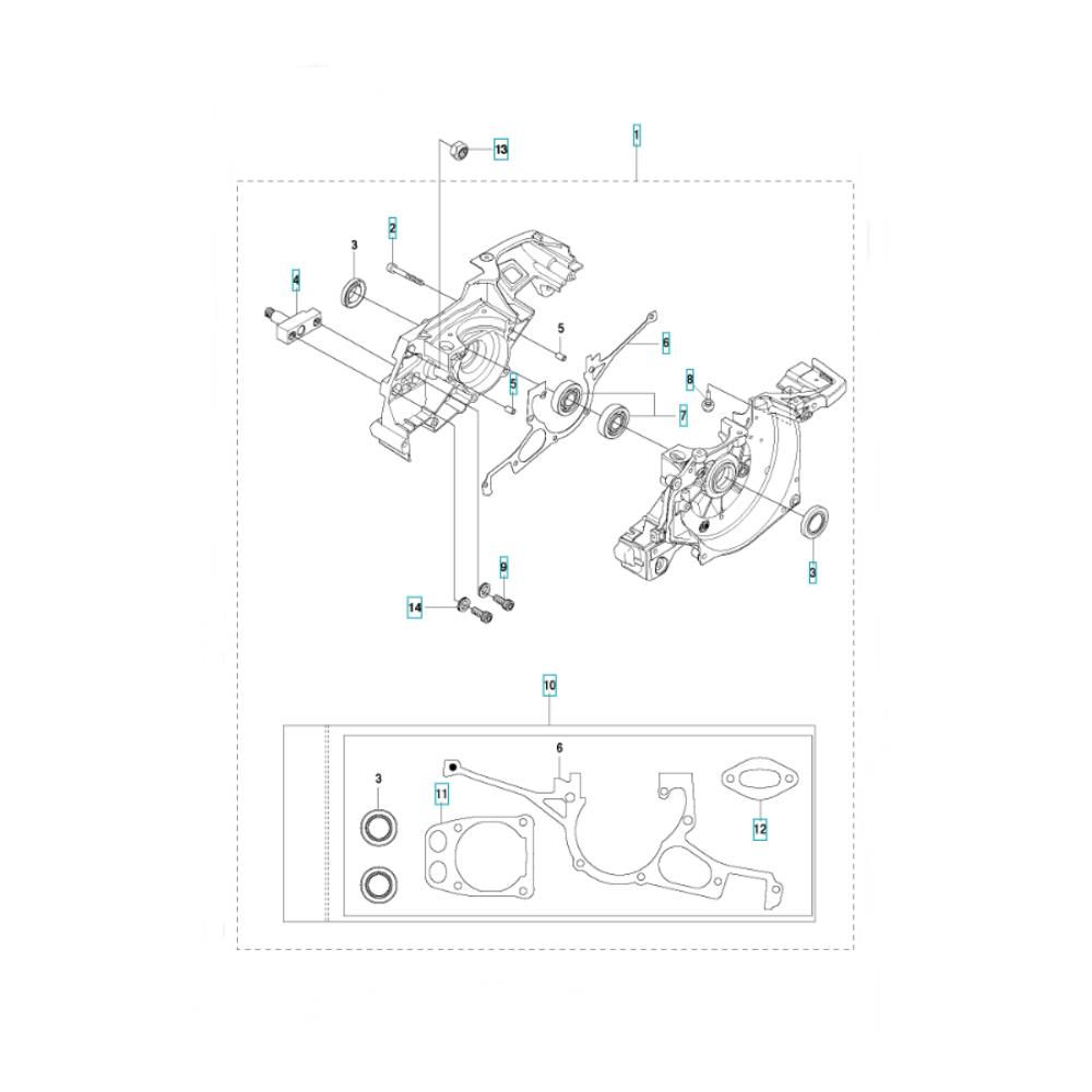 The Crankcase Assembly for the Husqvarna K970 Chain Concrete Cutter is designed to house and protect the engine's moving parts, ensuring optimal performance and longevity. This assembly includes key components such as gaskets, seals, and bearings, which are essential for maintaining the cutter's efficiency and reliability during heavy-duty cutting tasks.