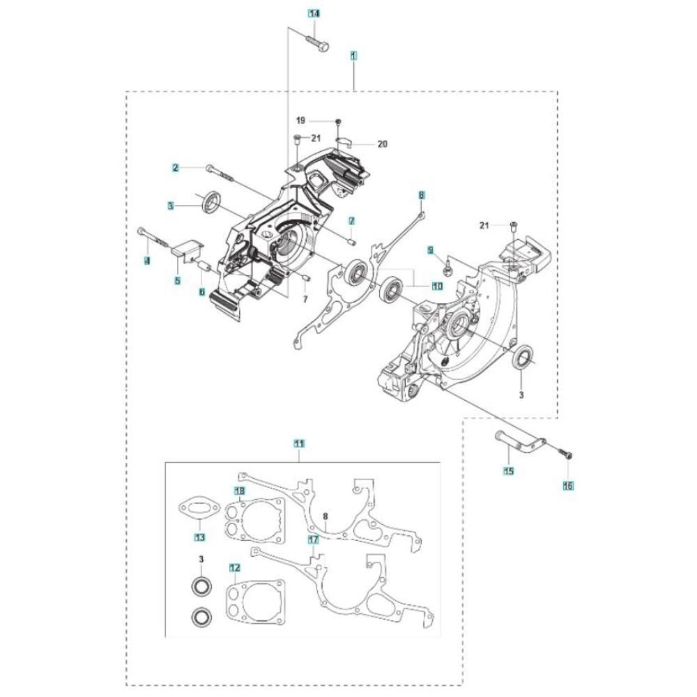 The Crankcase Assembly for the Husqvarna K970 Ring III Disc Cutter is crucial for housing and protecting the engine's moving parts. This assembly ensures optimal performance and longevity by maintaining the integrity of the engine components. It includes essential parts such as gaskets, seals, and fasteners, designed to withstand the rigours of heavy-duty cutting tasks.