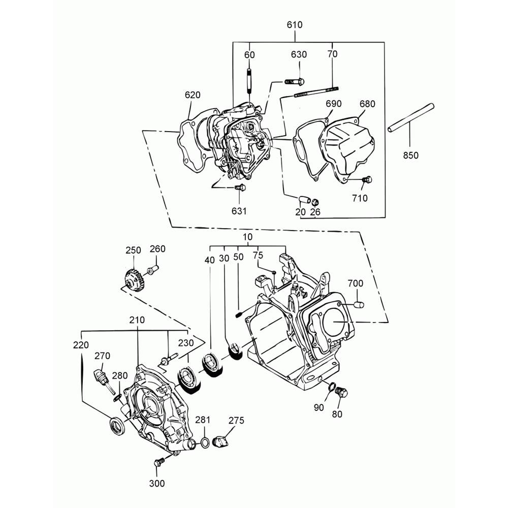 The Crankcase Assembly for the Wacker WM 270 Engine includes key components essential for housing and protecting the engine's moving parts. This assembly ensures optimal performance by maintaining proper alignment and reducing wear. Components such as gaskets, seals, and bolts are included to ensure a secure fit and reliable operation. Designed for durability, it supports efficient engine function and longevity.