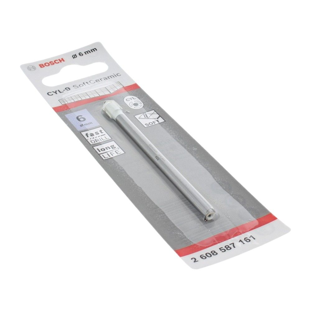 The Bosch CYL-9 6mm x 80mm Soft Ceramic Tile & Glass Drill Bit (OEM No. 2608587161) is a genuine Bosch accessory designed for clean, accurate drilling in soft to medium-hard ceramic tiles and glass. A tungsten carbide spear-point tip delivers precise starts and reduces skidding on smooth, glazed surfaces. The flute-free body supports smooth, controlled, low-speed drilling without the need for lubrication or cooling, helping to minimise chipping. With a straight, cylindrical shank for secure grip in standard three-jaw chucks, it suits both corded and cordless non-impact drills, including combi drills with the hammer function switched off. Overall size is 6mm diameter x 80mm length, making it a practical choice for bathroom, kitchen, and general tiling work where neat, accurate holes are required.