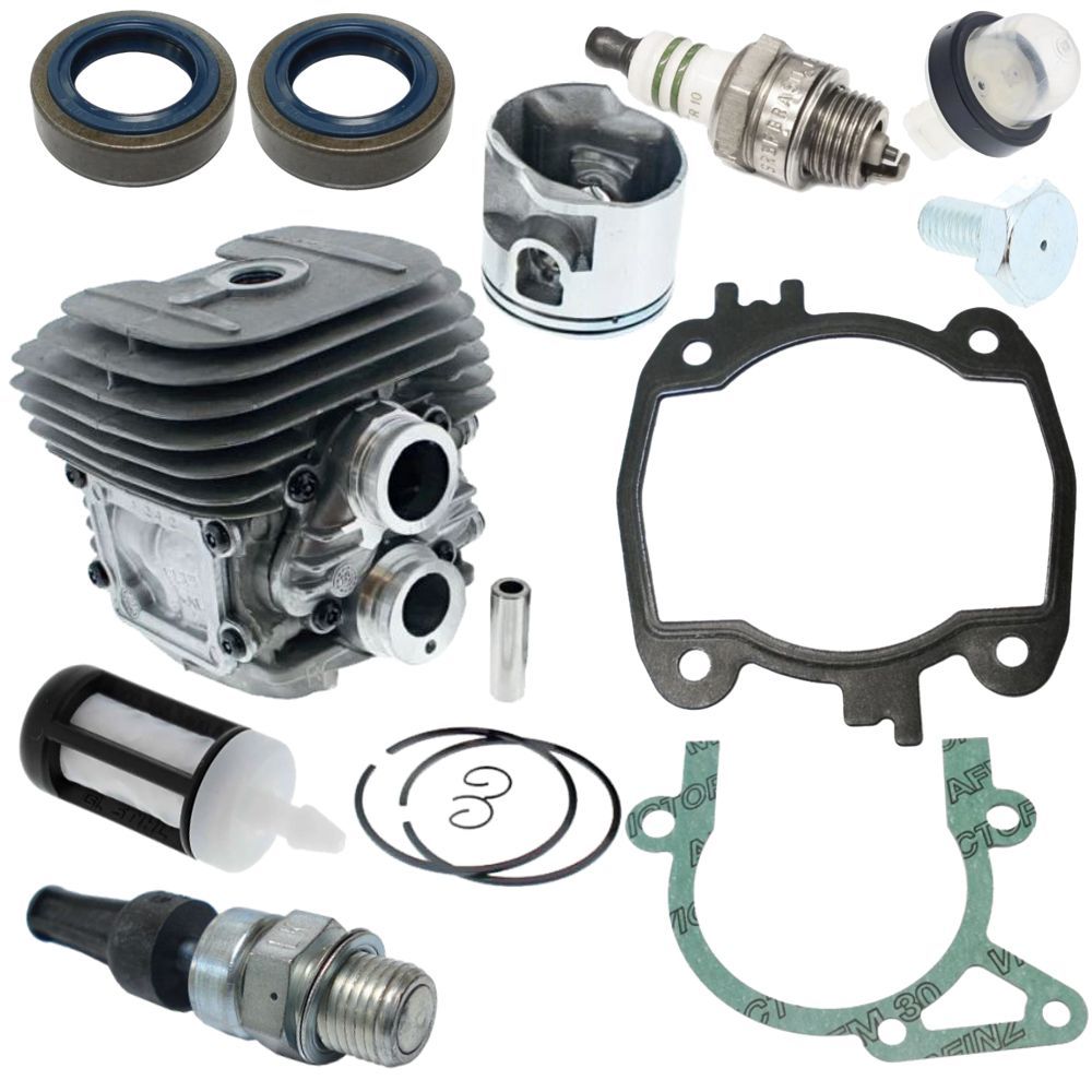 - Complete kit to support a full top-end refresh: cylinder, piston, gaskets, decompression valve, spark plug, fuel primer pump, fuel pick-up filter, bolt, and two oil seals