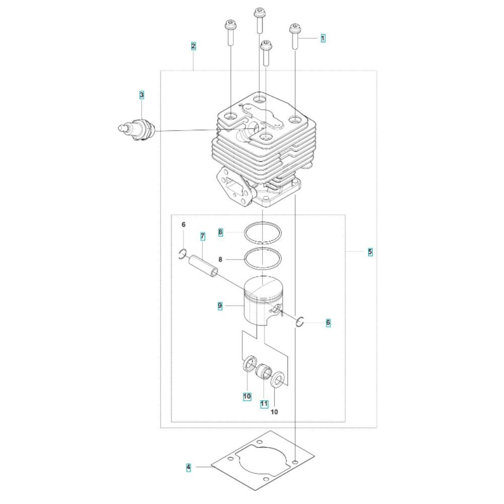 The Cylinder Assembly for the Husqvarna 143RS Brushcutter includes key components to ensure optimal engine performance and longevity. This assembly is crucial for maintaining the brushcutter's power and efficiency, providing a reliable seal and compression. Components typically include the cylinder, piston, rings, and gaskets, all designed to fit the Husqvarna 143RS model.
