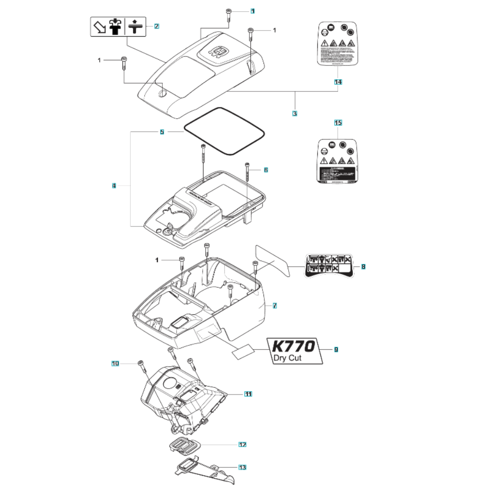 The Cylinder Cover Assembly for the Husqvarna K770 Dry Cut Disc Cutter is designed to protect the engine components and ensure optimal performance. This assembly includes essential parts such as the cover, fasteners, and seals, which help shield the cylinder from dust and debris during operation. Genuine Husqvarna parts ensure compatibility and durability, maintaining the cutter's reliability in demanding conditions.
