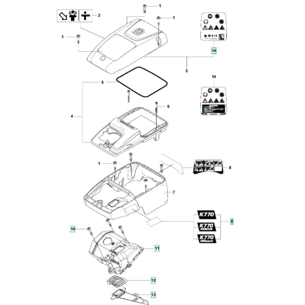The Cylinder Cover Assembly for the Husqvarna K770 Rescue Disc Cutter is designed to protect the engine components and ensure optimal performance. This assembly includes essential parts such as the cover, fasteners, and seals, which help maintain the machine's efficiency and longevity. Ideal for routine maintenance and repairs, it ensures the disc cutter operates smoothly under demanding conditions.