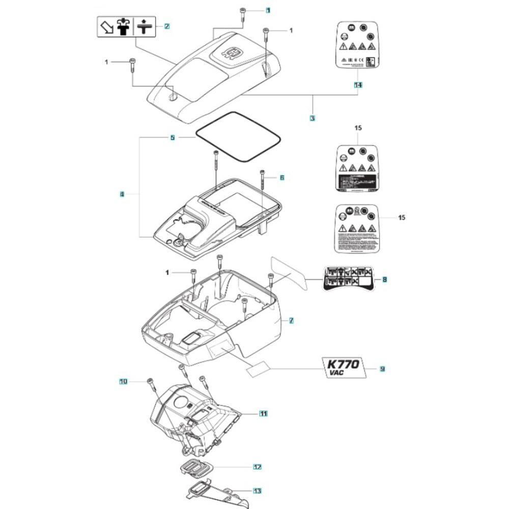 The Cylinder Cover Assembly for the Husqvarna K770 VAC Disc Cutter is essential for protecting the engine components from dust and debris during operation. This genuine Husqvarna part ensures optimal performance and longevity of your disc cutter. The assembly includes various components designed to fit seamlessly with the K770 VAC model, maintaining its efficiency and reliability.