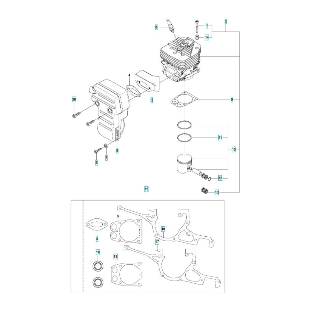 The Cylinder, Piston, Muffler Assembly for the Husqvarna K970 Chain III Concrete Cutter includes key components for optimal performance. This assembly ensures efficient combustion and exhaust flow, contributing to the cutter's power and longevity. Genuine Husqvarna parts are used to maintain the integrity and reliability of your concrete cutter.