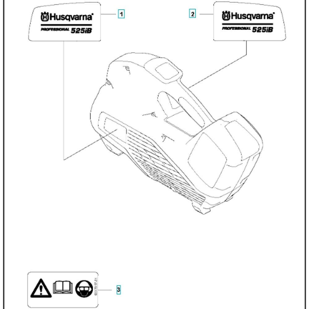 The Decal Assembly for the Husqvarna 525iB Battery Blower includes essential components for maintaining the blower's appearance and functionality. This assembly ensures that all decals are intact and visible, aiding in safety and operational guidance. Genuine Husqvarna parts are used to ensure compatibility and durability.