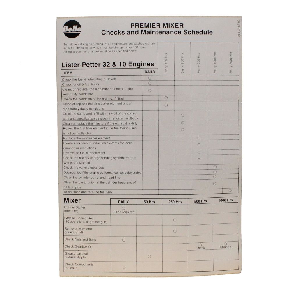 This decal is specifically used on Belle Premier XT site mixers, providing essential maintenance information directly on the equipment. It is an ideal replacement part for ensuring that your mixer remains in optimal working condition and that maintenance procedures are easily accessible.