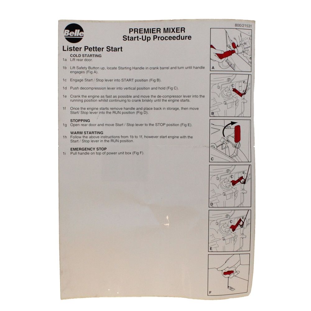 The Decal Lister Start - Up UK for Belle Premier XT Site Mixer is a genuine Altrad/Belle part, designed to ensure your site mixer is clearly labelled and easy to operate. This decal is crafted from high-quality materials to withstand the rigours of construction environments. It is specifically tailored for the Premier XT series, including models such as the 150XT and 175XT. By providing clear operational instructions, this decal aids in the safe and efficient use of your mixer, making it an essential component for both professional tradespeople and DIY enthusiasts.
