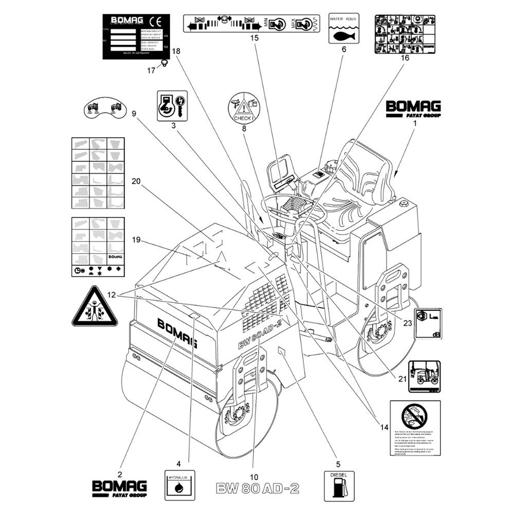 The Decal Assembly for the Bomag BW 80 AD-2 Roller includes essential components to ensure proper identification and operation of the machine. This assembly is crucial for maintaining the roller's appearance and compliance with safety standards. Genuine Bomag parts are designed for durability and precision, ensuring long-lasting performance.
