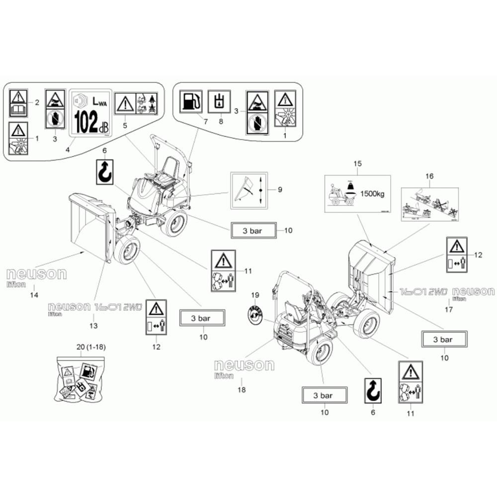 Decals for the Neuson 1601 Dumper are essential for maintaining the machine's appearance and ensuring safety information is clearly visible. These genuine Wacker Neuson parts are designed to fit perfectly and withstand the rigours of construction environments. Available in various designs and sizes to suit different parts of the dumper.
