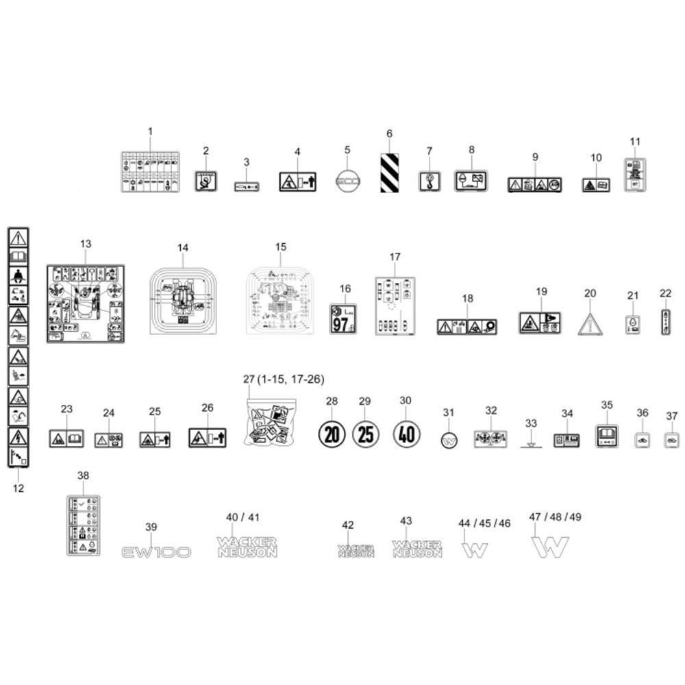 Decals for the Wacker EW100 Excavator are designed to ensure clear identification and safety information on your machinery. These genuine Wacker Neuson parts help maintain the professional appearance and compliance of your equipment. Available in various designs and sizes, they are essential for routine maintenance and equipment updates.