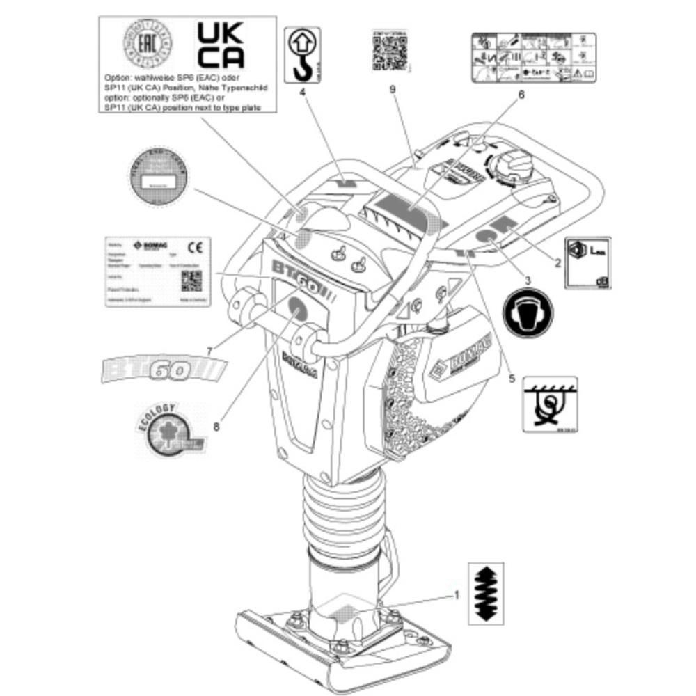 The Decals Assembly for Bomag BT60 Rammers includes essential markings and labels for proper identification and operation. These genuine Bomag spare parts ensure that safety instructions and operational guidelines are clearly visible, aiding in the safe and efficient use of the equipment. Available in various styles and configurations to suit different models and requirements.