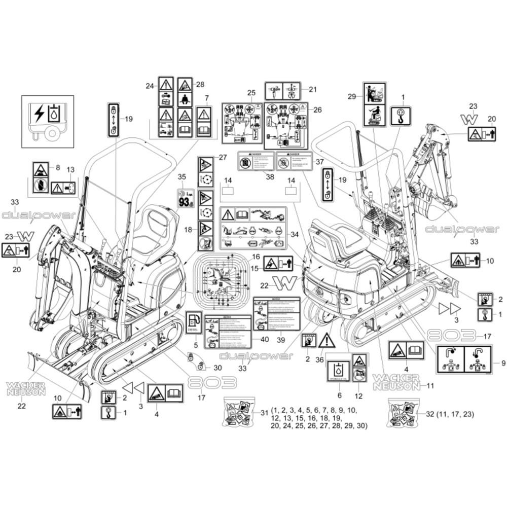 Decals for the Wacker 803 Mini Excavator, featuring dual power options, are essential for maintaining the machine's appearance and ensuring compliance with safety standards. These genuine Wacker Neuson parts are designed to withstand harsh environments, providing clear and durable markings for operational guidance and safety information.
