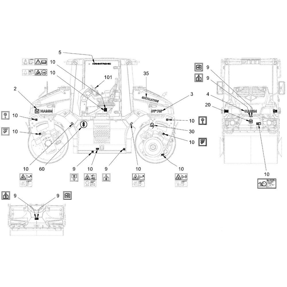 Decals for the Hamm DV+ 70i (H225) Roller are essential for maintaining the machine's professional appearance and ensuring compliance with safety standards. These genuine Hamm parts are designed to fit perfectly and withstand the rigours of construction environments. Available in various designs and sizes, they help identify the machine and provide necessary operational information.