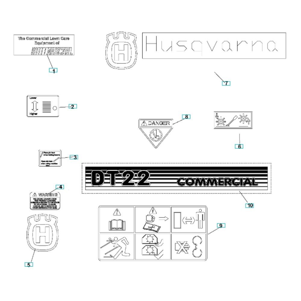 Decals for the Husqvarna DT22B5FA Dethatcher are designed to ensure clear identification and safety information on your equipment. These genuine Husqvarna parts are crucial for maintaining the machine's appearance and compliance with safety standards. Available in various designs and sizes, they help keep your dethatcher looking professional and functioning safely.