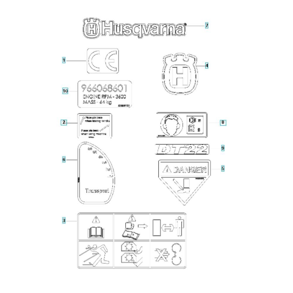 Decals for the Husqvarna DT22HNR CE Dethatcher are genuine parts designed to maintain the machine's original appearance and functionality. These decals ensure clear visibility of operational instructions and safety warnings, contributing to safe and efficient use. Available in various designs and sizes to fit specific parts of the dethatcher.