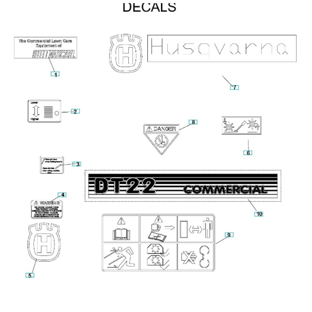 Decals for the Husqvarna DT22HNR Dethatcher are genuine parts designed to replace worn or damaged labels on your machine. These decals ensure that all safety and operational information remains visible and intact, contributing to safe and efficient use of the dethatcher. Available in various designs to match the original specifications.