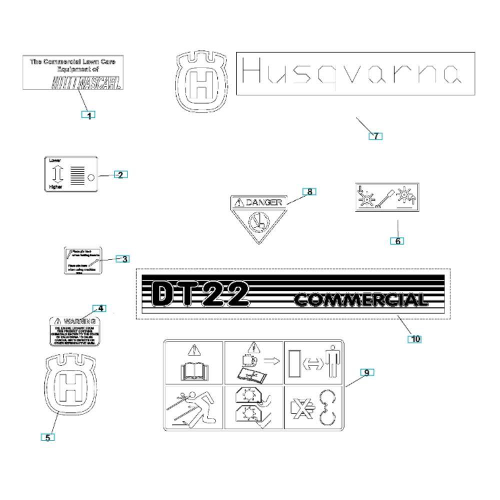 Decals for the Husqvarna DT22NEFA Dethatcher are essential for maintaining the machine's appearance and ensuring proper operation. These genuine Husqvarna parts include various labels and stickers that provide important safety and operational information. Designed to withstand outdoor conditions, they help keep your dethatcher in compliance with safety standards.