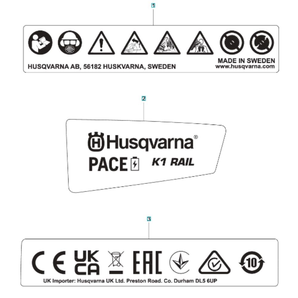 Decals designed for the Husqvarna K1 PACE RAIL Battery Disc Cutter enhance the machine's appearance and ensure brand authenticity. These decals are available as both genuine and non-genuine Husqvarna parts, offering flexibility in choice. Ideal for maintaining the professional look of your equipment, they are easy to apply and durable under various working conditions.