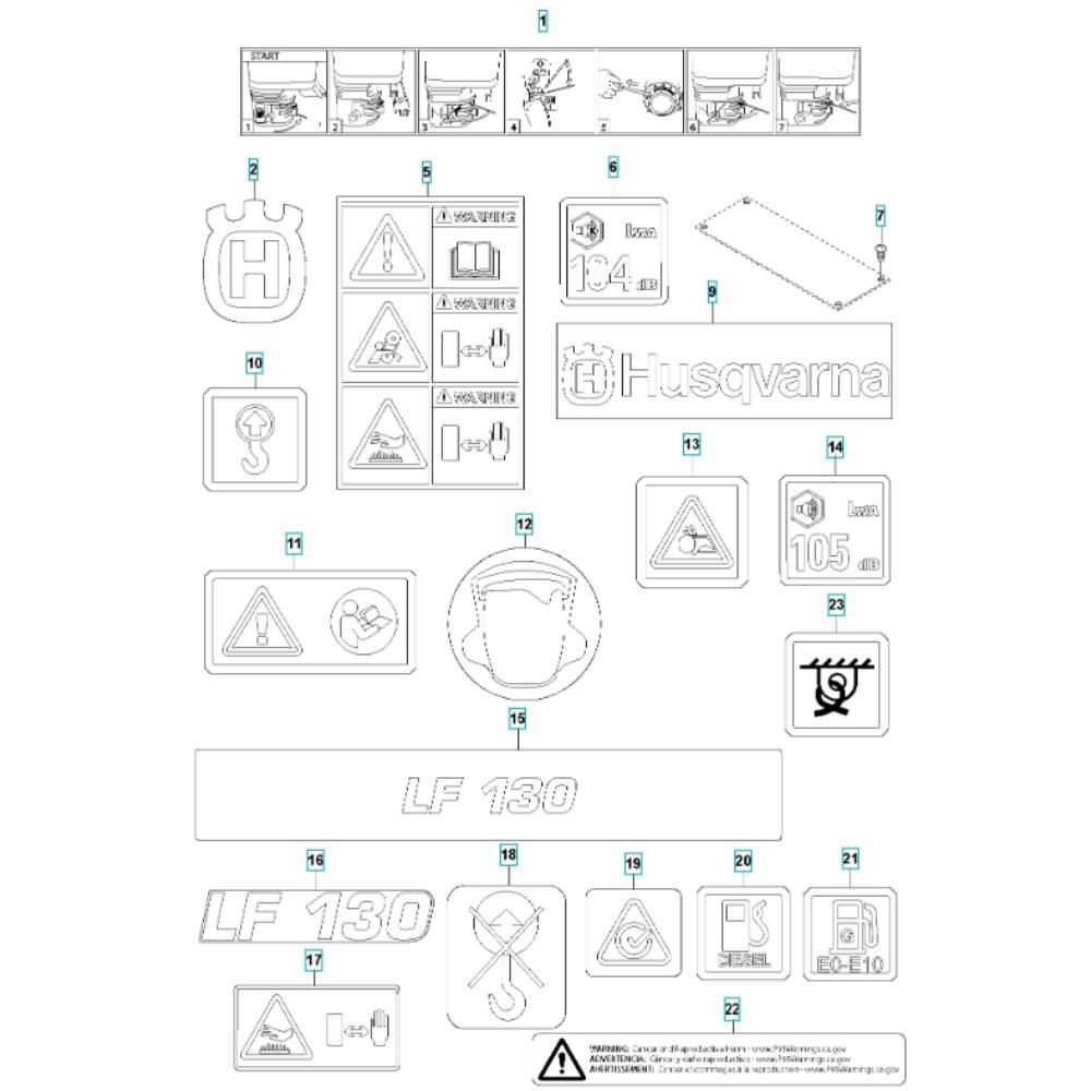 Decals for the Husqvarna LF 130 LT Diesel Compactor are essential for maintaining the machine's appearance and ensuring proper identification of controls and safety information. These genuine Husqvarna parts are designed to fit perfectly, providing clear and durable labels for your equipment. Ideal for routine maintenance and replacement, they help keep your compactor compliant with safety standards.