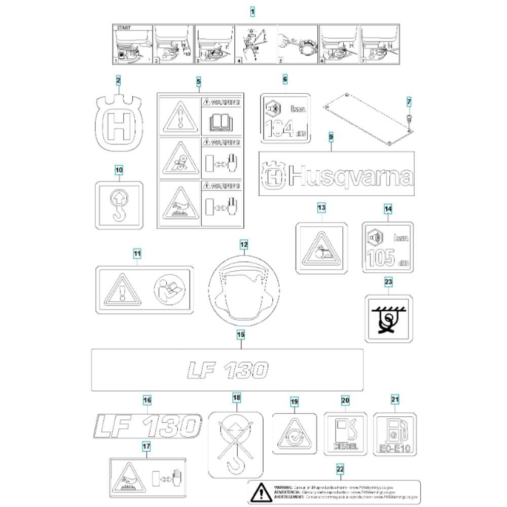 Decals for the Husqvarna LF 130 LT Petrol Compactor are designed to replace worn or damaged labels, ensuring clear visibility and safety information. These genuine Husqvarna parts help maintain the machine's professional appearance and compliance with operational standards. Suitable for routine maintenance and refurbishment tasks.