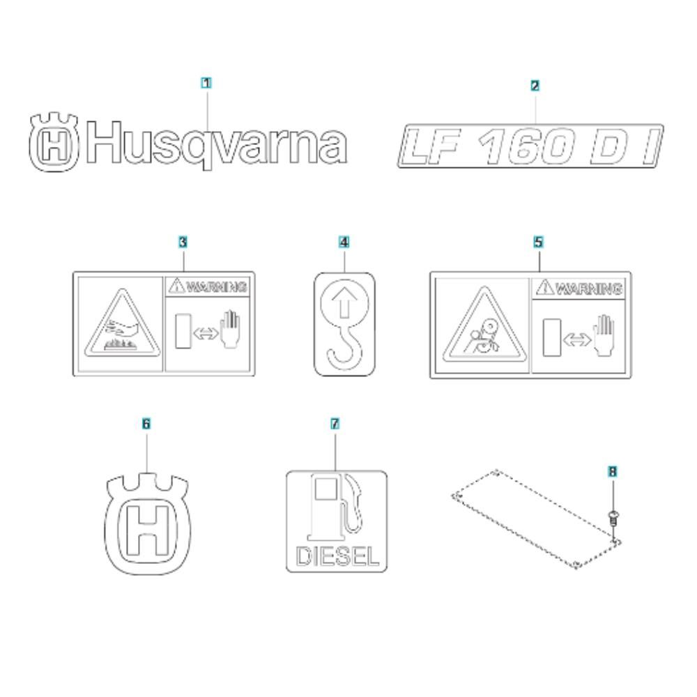 Decals for the Husqvarna LF 160 Diesel Compactor ensure clear identification and safety information. These genuine Husqvarna parts are designed to withstand outdoor conditions, maintaining visibility and durability. Suitable for routine maintenance and replacement, they help in preserving the machine's appearance and compliance with safety standards.