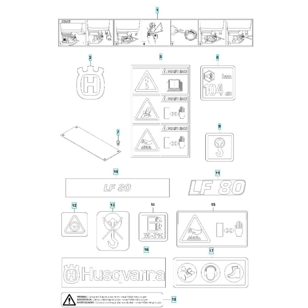 Decals for the Husqvarna LF 80 LAT Compactor are essential for maintaining the machine's appearance and ensuring proper identification. These genuine Husqvarna parts are designed to withstand outdoor conditions, providing durability and longevity. Ideal for replacing worn or damaged decals, they help keep your compactor looking professional and well-maintained.