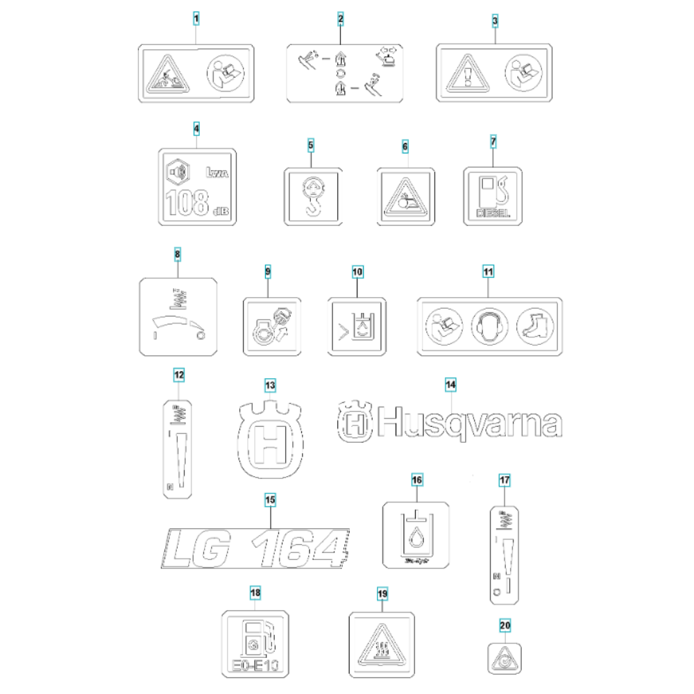 Decals for the Husqvarna LG 164 Diesel Reversible Compactor are essential for maintaining the machine's appearance and ensuring safety information is visible. These genuine Husqvarna parts are designed to withstand the rigours of construction environments, providing durability and clarity. Available in various designs to match the original specifications.