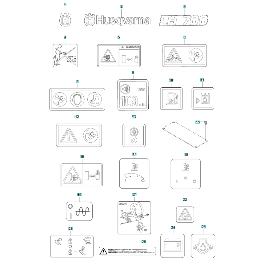 Decals for the Husqvarna LH 700 Reversible Compactor are essential for maintaining the machine's appearance and ensuring safety instructions are visible. These genuine Husqvarna parts are designed to fit perfectly, providing clear and durable labels for operational guidance and branding. Available in various styles to suit different needs.