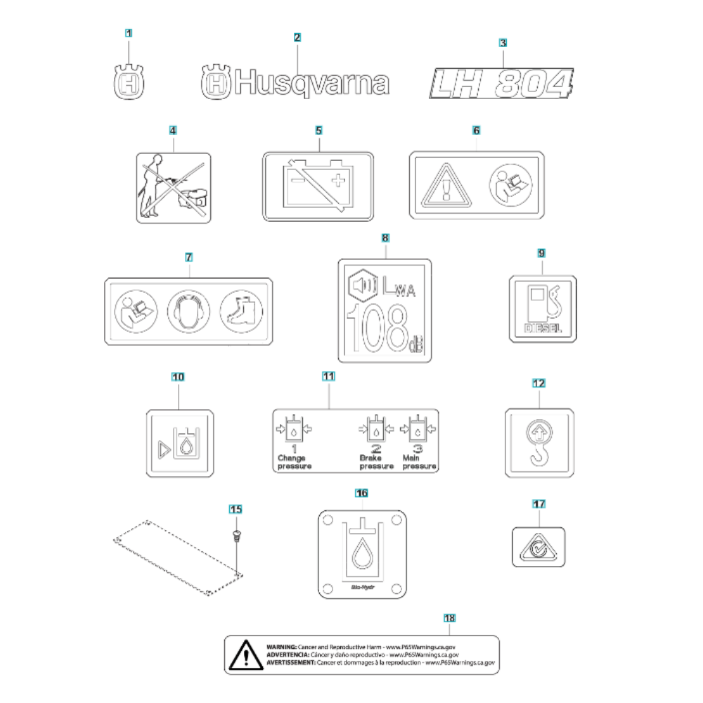 Decals for the Husqvarna LH 804 Reversible Compactor are essential for maintaining the machine's appearance and ensuring clear identification of controls and safety information. These genuine Husqvarna parts are designed to withstand outdoor conditions, providing durability and long-lasting visibility. Available in various designs to match the original specifications.