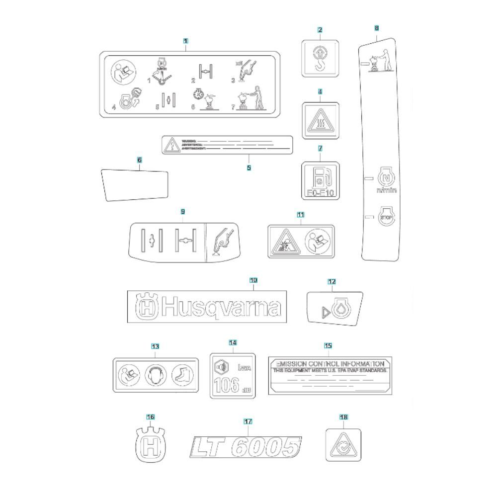 Decals for the Husqvarna LT 6005 H Trench Rammer are designed to ensure clear identification and compliance with safety standards. These genuine Husqvarna parts help maintain the professional appearance and functionality of your equipment. Suitable for replacing worn or damaged decals, they are essential for routine maintenance and safety checks.