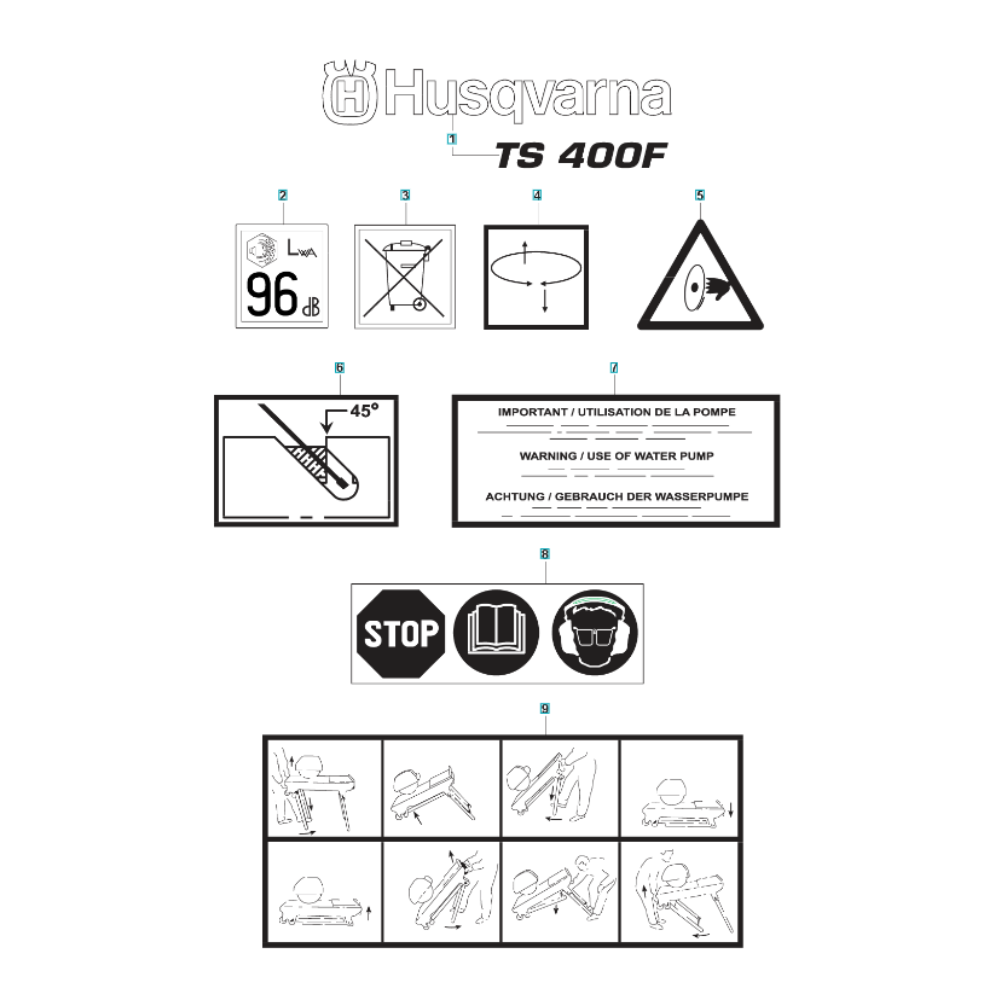 Decals for the Husqvarna TS 400 F Masonry Saw are essential for maintaining the machine's appearance and ensuring proper identification of controls and safety information. These genuine Husqvarna parts are designed to withstand the rigours of masonry work, providing durability and clarity. Available in various designs to suit different needs.