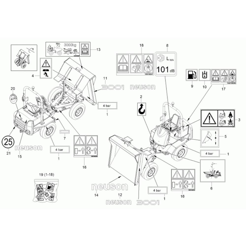 Decals for the Neuson 3001 Dumper are essential for maintaining the machine's appearance and ensuring compliance with safety standards. These genuine Wacker Neuson parts are designed to fit perfectly and withstand the rigours of construction environments. Available in various designs and sizes, they help in identifying the machine and providing necessary operational information.