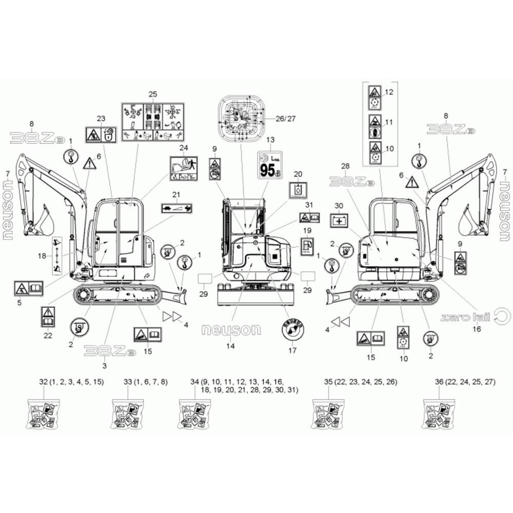 Decals for the Neuson 38Z3 Mini Excavator are essential for maintaining the machine's appearance and ensuring compliance with safety and operational standards. These genuine Wacker Neuson parts are designed to fit perfectly and withstand the rigours of construction environments. Available in various designs and sizes, they help in identifying and branding the equipment effectively.