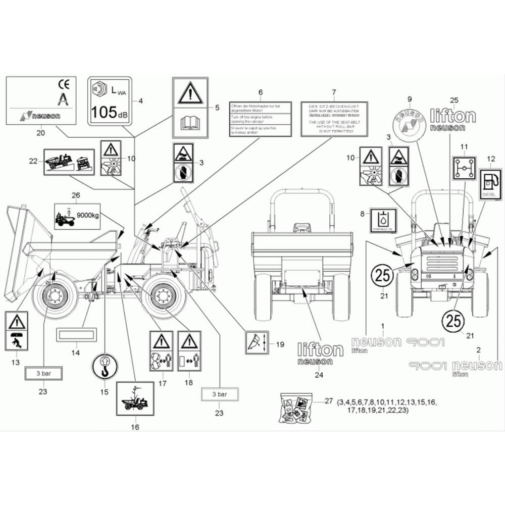 Decals for the Neuson 9001 Dumper are essential for maintaining the machine's appearance and ensuring compliance with safety standards. These genuine Wacker Neuson parts are designed to withstand harsh environments and provide clear, durable markings. Ideal for replacements or upgrades, they help keep your dumper looking professional and well-maintained.