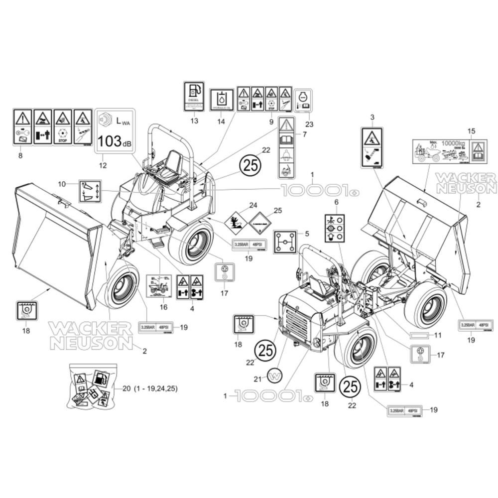 Decals for the Wacker 10001 Dumper provide essential identification and safety information, ensuring compliance with operational standards. These genuine Wacker Neuson parts are designed to withstand harsh environments, maintaining visibility and durability. Suitable for routine maintenance or replacement, they help keep your equipment clearly marked and in line with safety regulations.