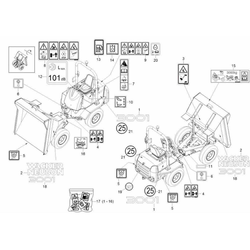Decals for the Wacker 3001AE Dumper are essential for maintaining the machine's professional appearance and ensuring safety compliance. These genuine Wacker Neuson parts are designed to withstand harsh conditions and provide clear, durable labelling. Suitable for various applications, they help identify controls, warnings, and branding, contributing to efficient operation and maintenance.