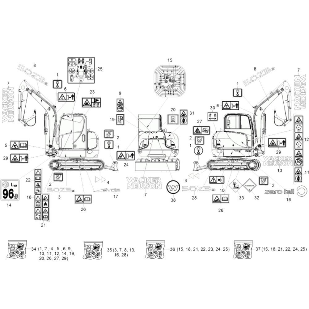 Decals for the Wacker 50Z3 Mini Excavator are designed to replace worn or damaged markings, ensuring clear visibility and compliance with safety standards. These genuine Wacker Neuson parts are essential for maintaining the professional appearance and operational clarity of your excavator. Available in various designs and sizes to suit different parts of the machine.