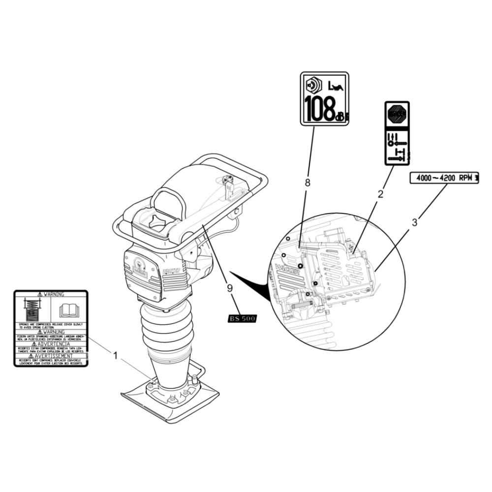 Decals for the Wacker BS500-4 Trench Rammer are essential for maintaining the machine's professional appearance and ensuring safety instructions are visible. These genuine Wacker Neuson parts are designed to withstand harsh conditions, providing durability and longevity. Ideal for replacing worn or damaged decals, they help keep your equipment compliant and easily identifiable.